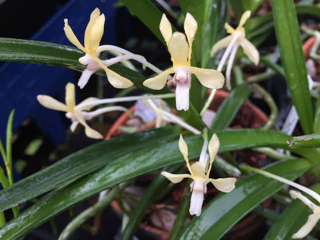 This small to medium sized Vanda is a great addition for any orchid collection. It is a primary hybrid of V. falcata x V. testacea. They are monopodial epiphytes and are easy gowing. They do very well in pots or baskets with bark.